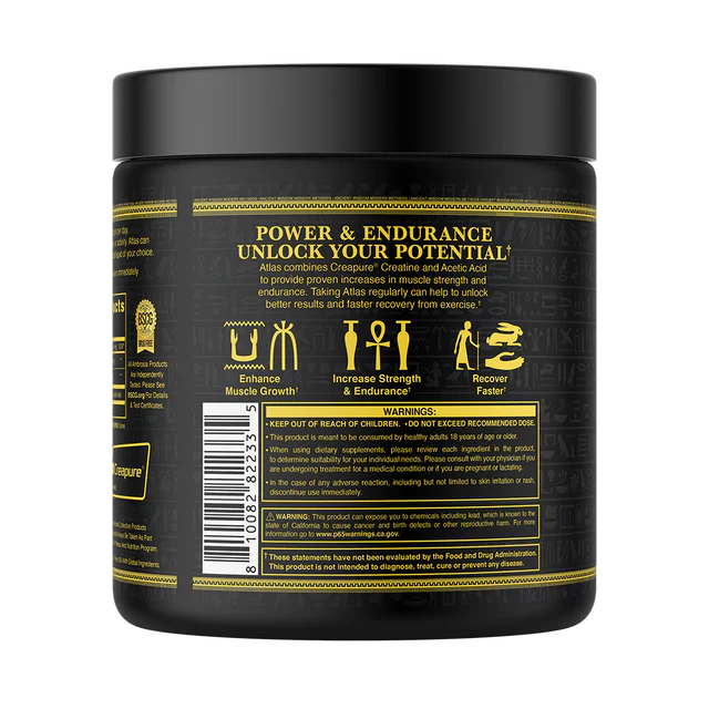 Atlas combines Creapure Creatine and Acetic Acid to provide proven increases in musclecreatine strength and endurance. Taking Atlas regularly can unlock better results and faster recovery from exercise.