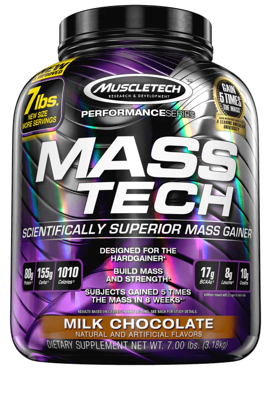 Performance Series. New & Improved. Advanced Muscle Mass Gainer. Designed For The Hardgainer. Build Mass & Strength. Multi-Phase Protein System. Formulated With Omega-Rich Fats. 80g Protein. 1170 Calories. 7g Leucine. 13g BCAAs. 10g Creatine. 7lbs New Size More Servings. If you're serious about performance and results, you need the All New MuscleTech Performance Series! No Proprietary Blends. No Fillers. No Underdosed Key Ingredients. No Hype. No Banned Substances (WADA). No Exceptions. Just the Most Powerful Formulas Available. Mass-Tech - More Protein, Better-Quality Calories, Bigger Results! New Mass-Tech is an advanced muscle mass gainer designed for any individual that has a tough time adding size, is in their bulking phase and/or wants to break through their strength plateaus. Power-packed with 80 grams of protein and 1170 mass-producing calories when mixed with 2 cups of skim milk, this potently superior formula is enhanced with proven anabolic drivers for rapid mass gain and strength! Better-Quality Calories Designed for the Hardgainer. Mass-Tech is the most versatile weight gainer available, which can be taken once daily or split into two separate half servings. The new, powerful formula now delivers a massive 1170 calories derived from high-quality protein and quickly digested carbohydrates, as well as specialized fats. More Protein per Serving Than Other Weight Gainers. New and improved formula features an 80 gram multi-phase protein system, when mixed with 2 cups of skim milk, that supplies fast, medium and slow-digesting proteins. The multi-phase protein system provides critical amino acids to the body at varying speeds for extended delivery of amino acids in the blood. More BCAAs and L-Leucine per Serving Than Other Weight Gainers. The formula's protein dose when mixed with 2 cups of skim milk supplies a massive 7 grams of L-leucine and 13 grams of BCAAs, which help fuel your skeletal muscles, preserve muscle glycogen stores and help to reduce the amount of protein breakdown. Added Amino Acids for Enhanced Effects. Beyond the key ingredients it supplies, Mass-Tech also provides additional ingredients, such as a 3-gram dose of L-alanine. L-alanine is the second-most used amino acid after L-leucine in protein synthesis. It has even been noted to play a role in glucose production for useable energy. The formula also delivers a 3-gram dose of Glycine, an amino acid that may help in the formation of many other biological compounds in the body, such as proteins and creatine. Taurine was also included as it's the second-most abundant amino acid found in muscle, after glutamine, and aids cell volumization. Build Strength Faster. Unlike other leading gainers that contain little to no creatine, Mass-Tech delivers a 10-gram clinically validated dose to increase strength fast. Help Replenish Glycogen Stores. Supplies 168 grams of carbohydrates through a multi-phase carb complex to both spike insulin, quickly shuttling creatine into the muscle, and promote muscle glycogen replenishment, helping to put the body into an anabolic state. Formulated with Omega-Rich Fats. The full-spectrum formula contains less saturated fat than other weight gainers and is formulated with 5 grams of omega-rich fats, which provides energy-dense calories. Get More for Your Money. Unlike the competition, Performance Series products contain superior key ingredients in clinically dosed amounts that are fully disclosed so you know exactly what you are paying for. Best-In-Class Taste. Every flavor won in head-to-head third-party taste tests against the leading competitors.