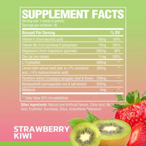 Sleep utilizes an abundance of quality ingredients to help you fall asleep, and stay asleep. This lineup included Magnesium, B6 and Vitamin C which all act as cofactors along the conversion processes of tryptophan (also included in RAW Sleep) to serotonin and further down the line to melatonin.