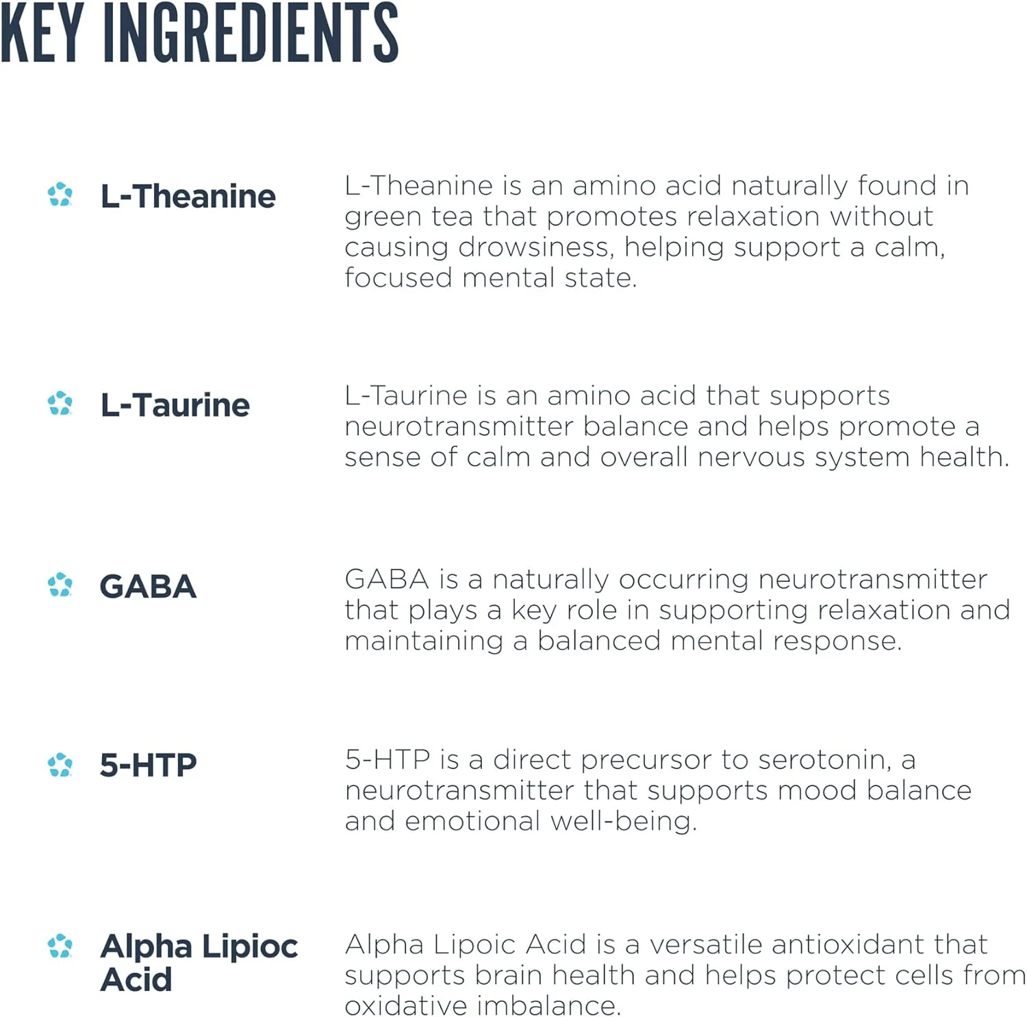 L-Theanine and GABA help quiet mental chatter, reduce feelings of overwhelm, and support peaceful, focused relaxation. -